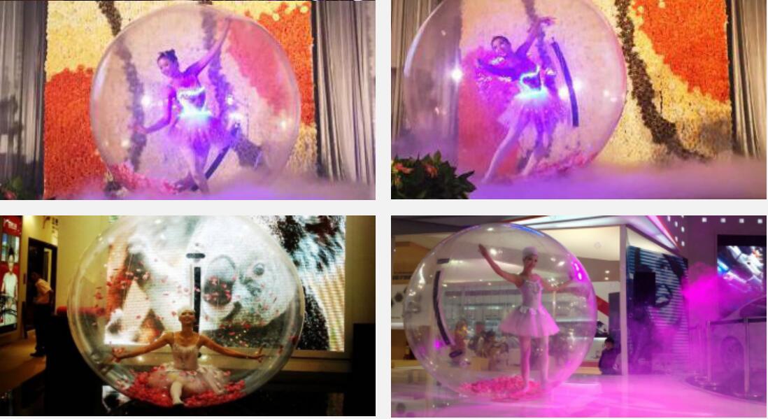 婀娜多姿的舞蹈演員身穿現(xiàn)代時尚的演出服,在直徑2米的透明水晶球內(nèi)翩翩起舞,似精靈一般迷人,整個現(xiàn)場充滿了唯美的浪漫氣息。
